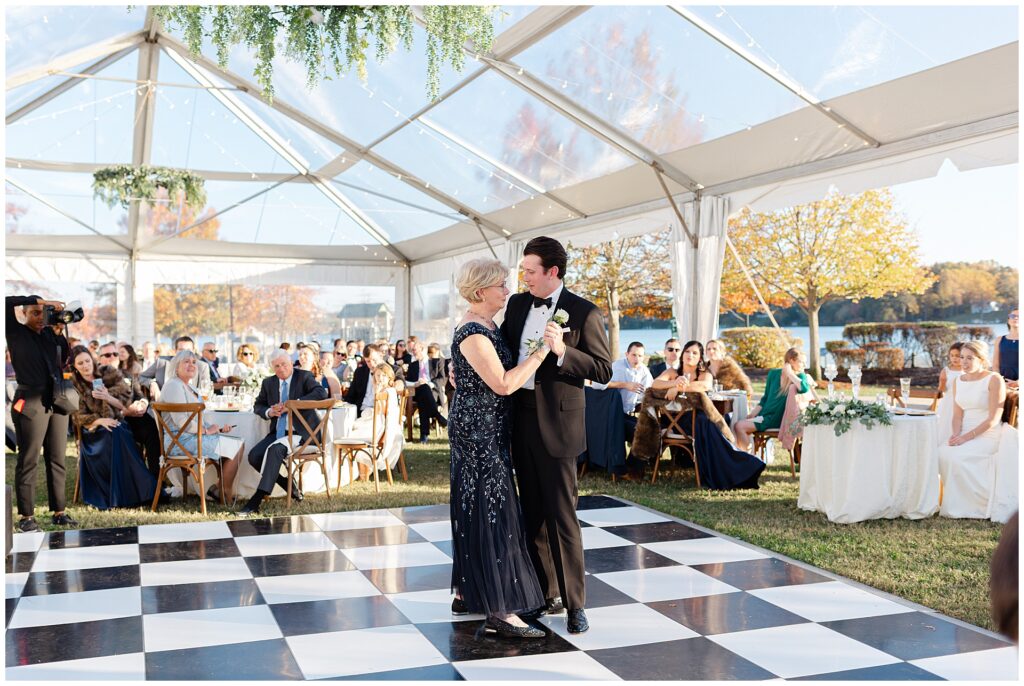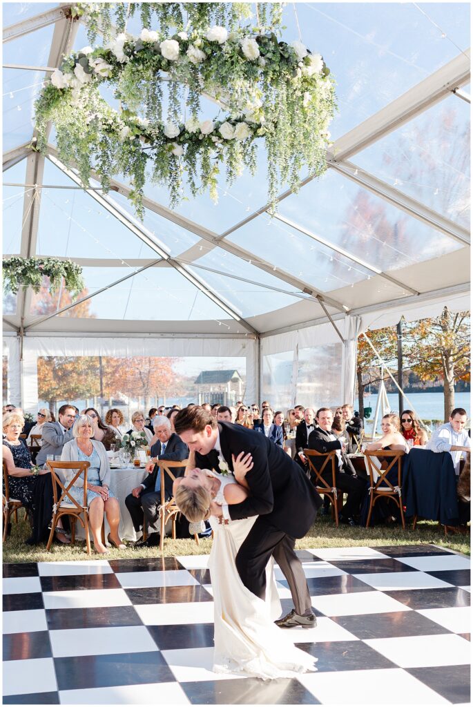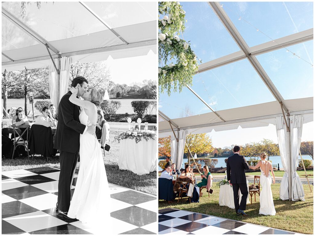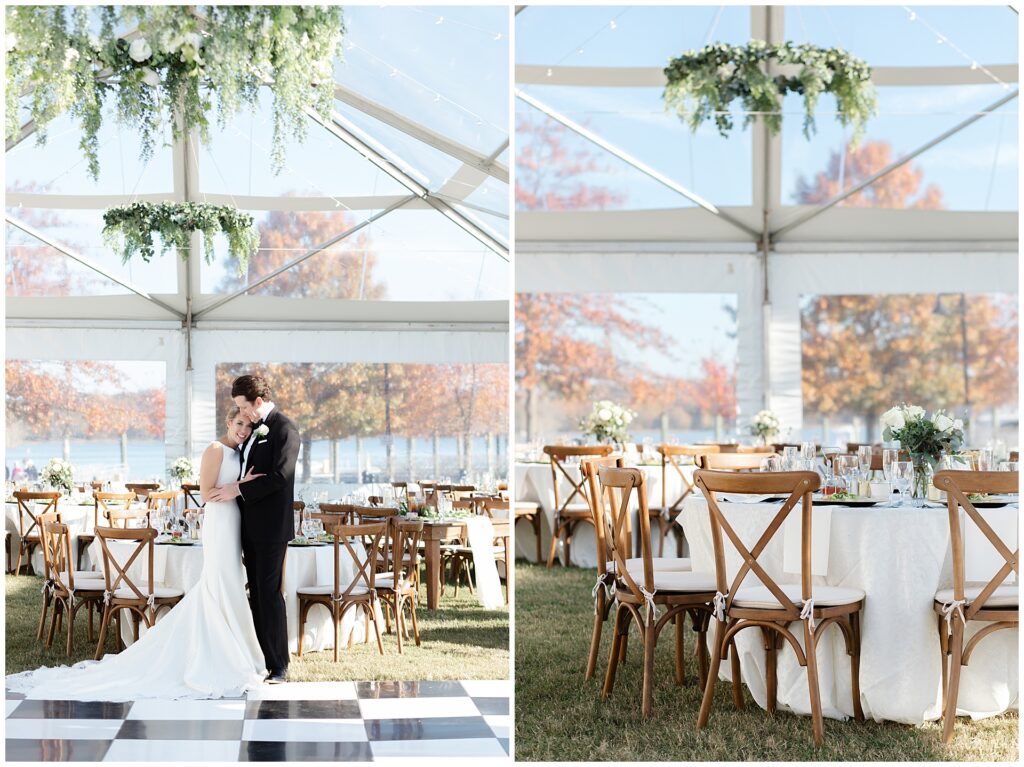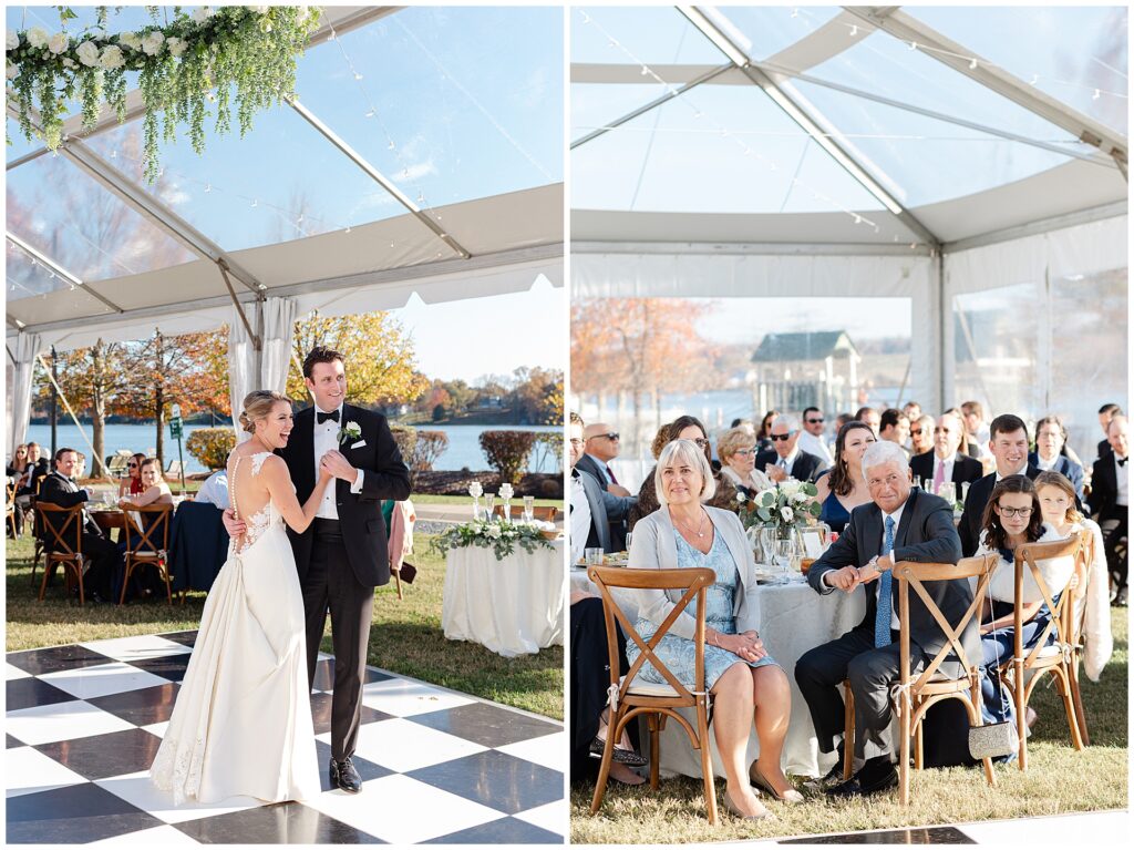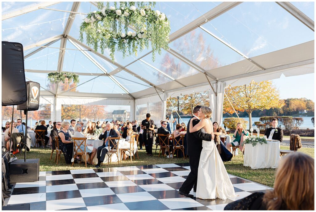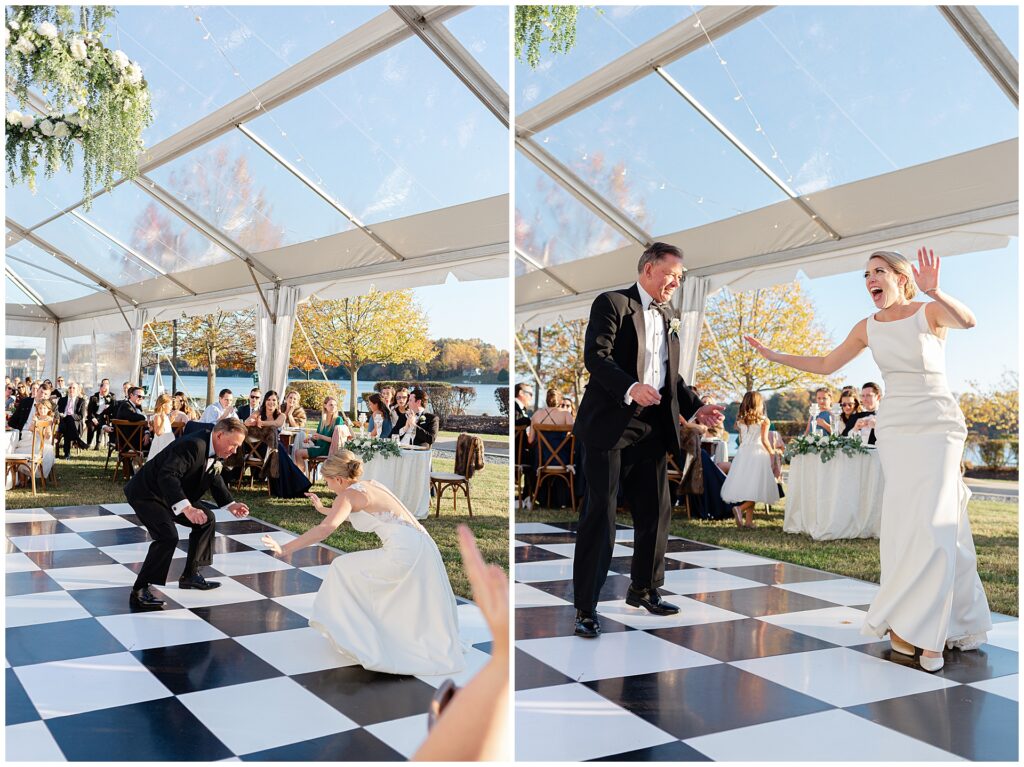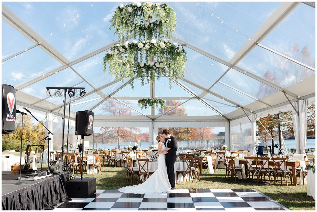 Waterfront weddings are at their strongest when the design allows the setting to breathe. Rather than leaning into overt nautical themes, many couples opt for timeless, architectural choices that frame the landscape instead of competing with it. Clear-top tents are especially effective along the water, allowing the sky, sunset, and surrounding environment to remain present well into the evening. Softer tenting materials and neutral palettes keep the focus on texture, movement, and light. Another popular option for Maryland waterfront weddings is a sailcloth tent. With its gentle peaks and warm, natural fabric, sailcloth offers an organic nod to the nautical setting without feeling overly scripted or literal. When paired with refined design elements, it creates a setting that feels intentional, elevated, and deeply connected to place. In this wedding, elements like a black-and-white checkered dance floor grounded the space with classic structure, while the clear-top tent preserved uninterrupted views of the waterfront. A live oyster shucking bar added a subtle sense of place—thoughtful and regionally inspired without becoming themed or forced.