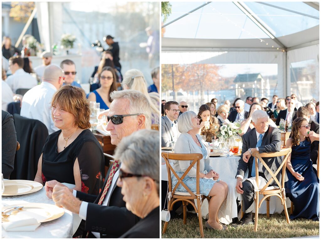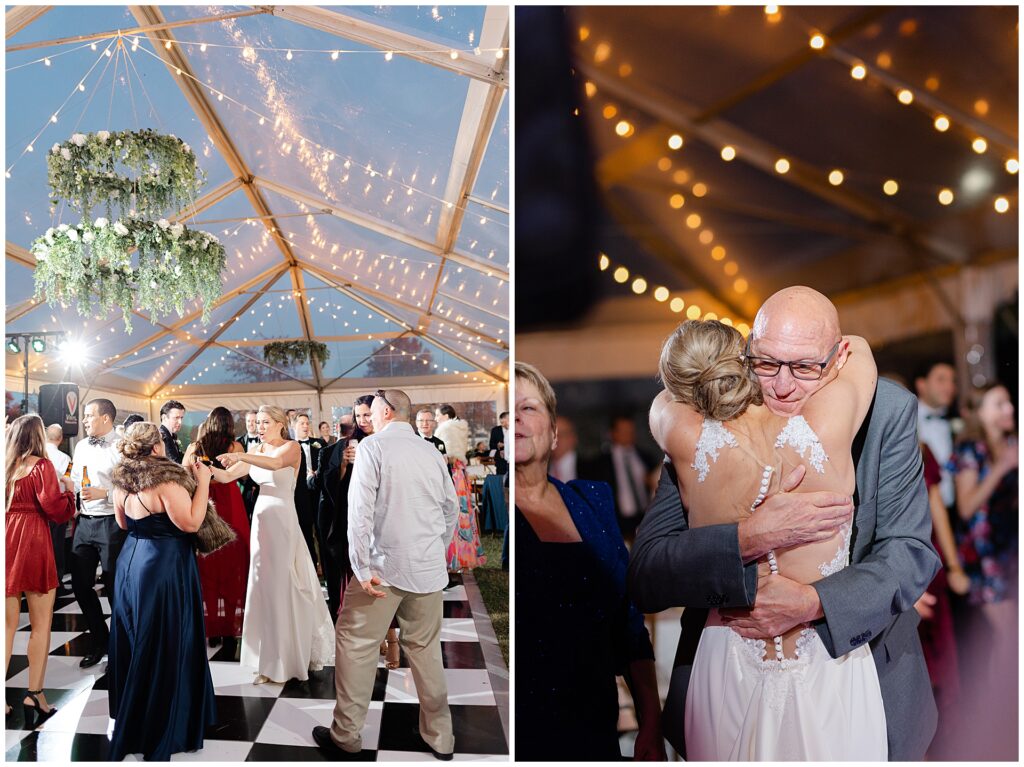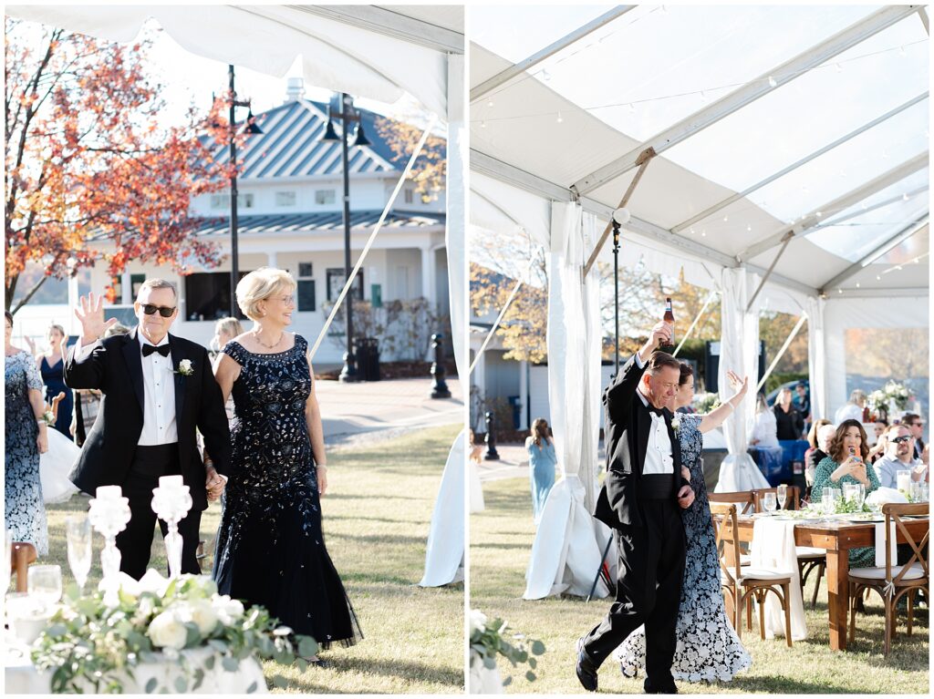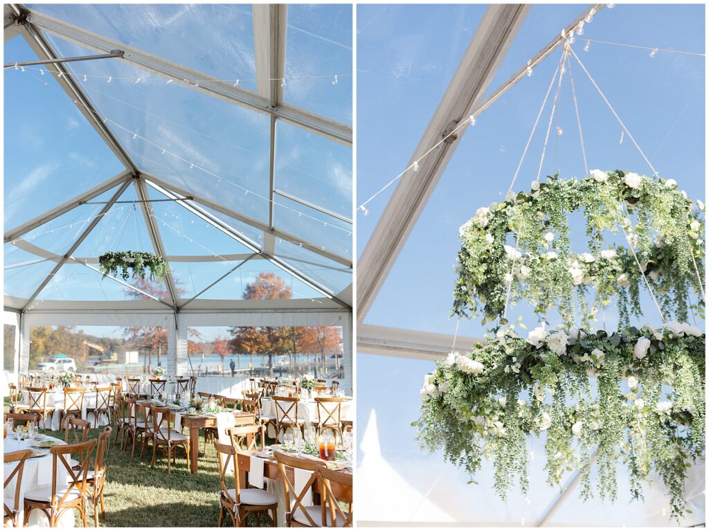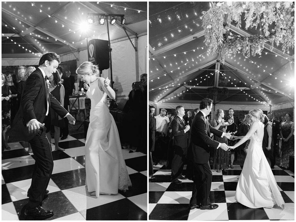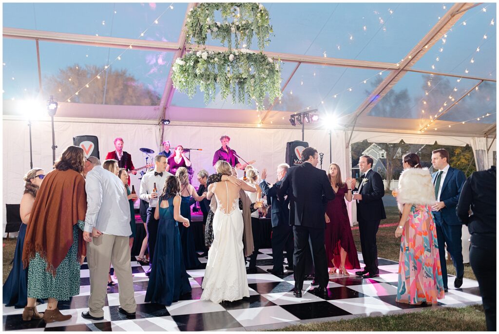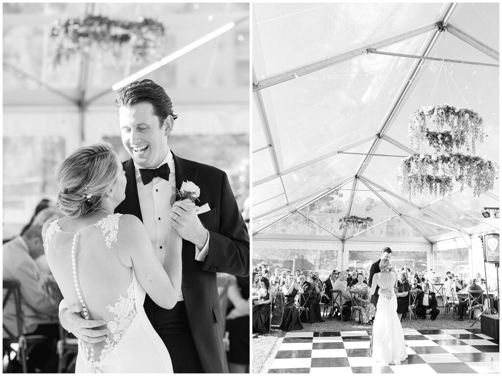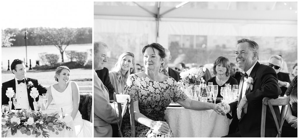 Waterfront weddings are at their strongest when the design allows the setting to breathe. Rather than leaning into overt nautical themes, many couples opt for timeless, architectural choices that frame the landscape instead of competing with it. Clear-top tents are especially effective along the water, allowing the sky, sunset, and surrounding environment to remain present well into the evening. Softer tenting materials and neutral palettes keep the focus on texture, movement, and light. Another popular option for Maryland waterfront weddings is a sailcloth tent. With its gentle peaks and warm, natural fabric, sailcloth offers an organic nod to the nautical setting without feeling overly scripted or literal. When paired with refined design elements, it creates a setting that feels intentional, elevated, and deeply connected to place. In this wedding, elements like a black-and-white checkered dance floor grounded the space with classic structure, while the clear-top tent preserved uninterrupted views of the waterfront. A live oyster shucking bar added a subtle sense of place—thoughtful and regionally inspired without becoming themed or forced.