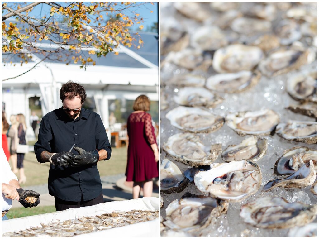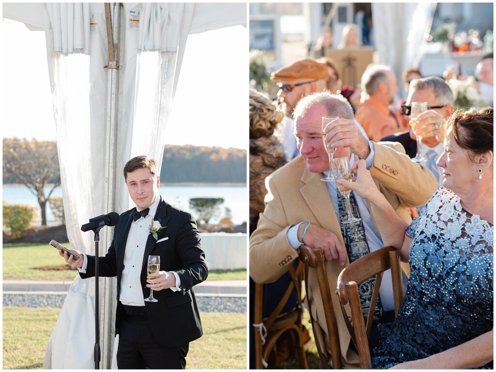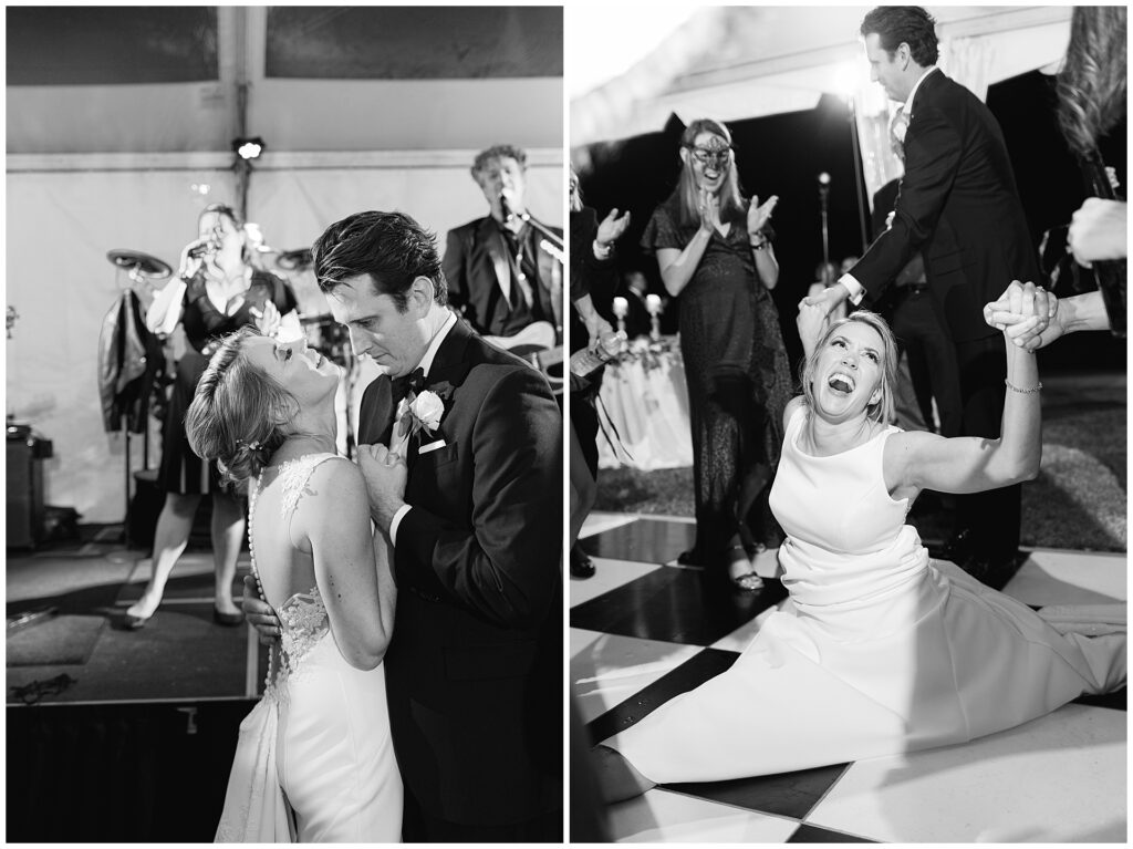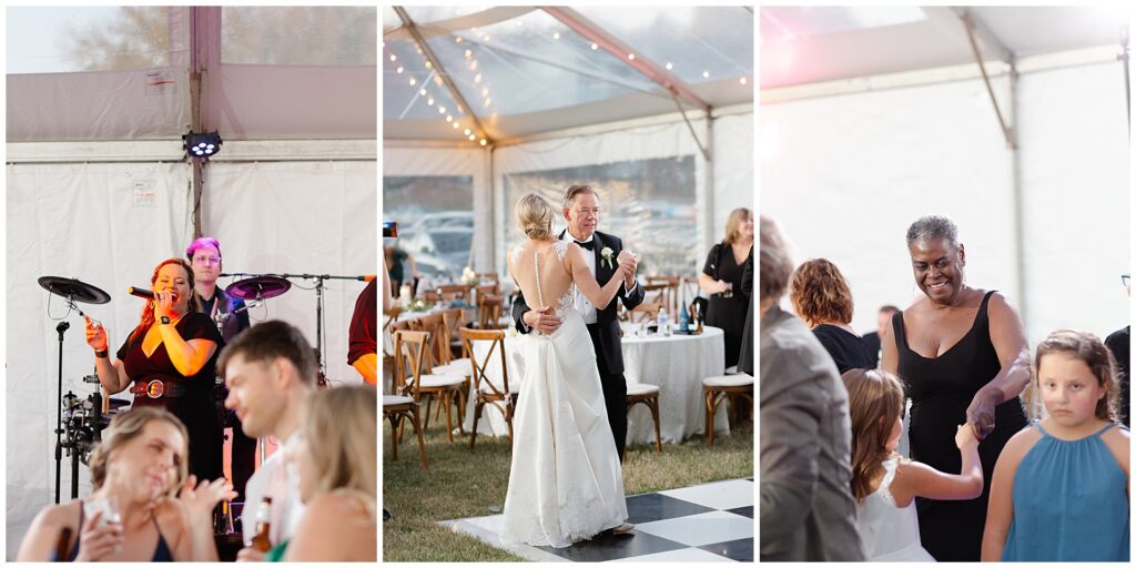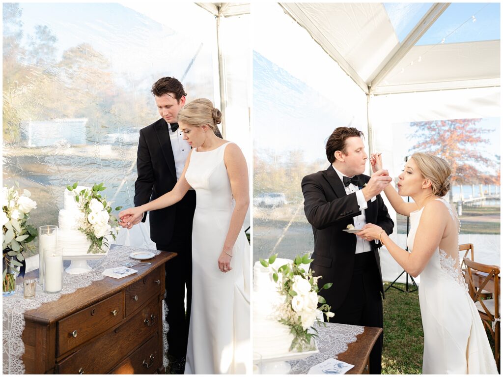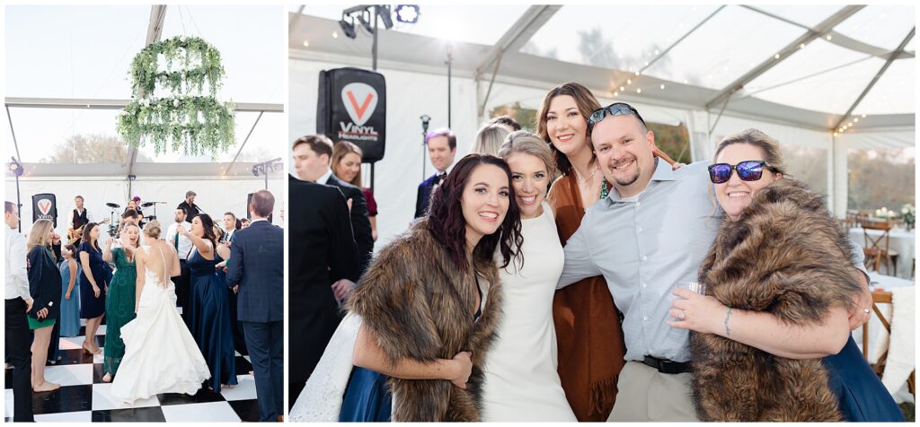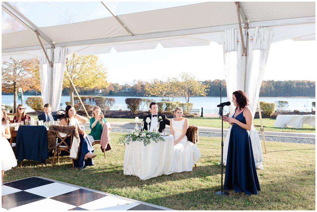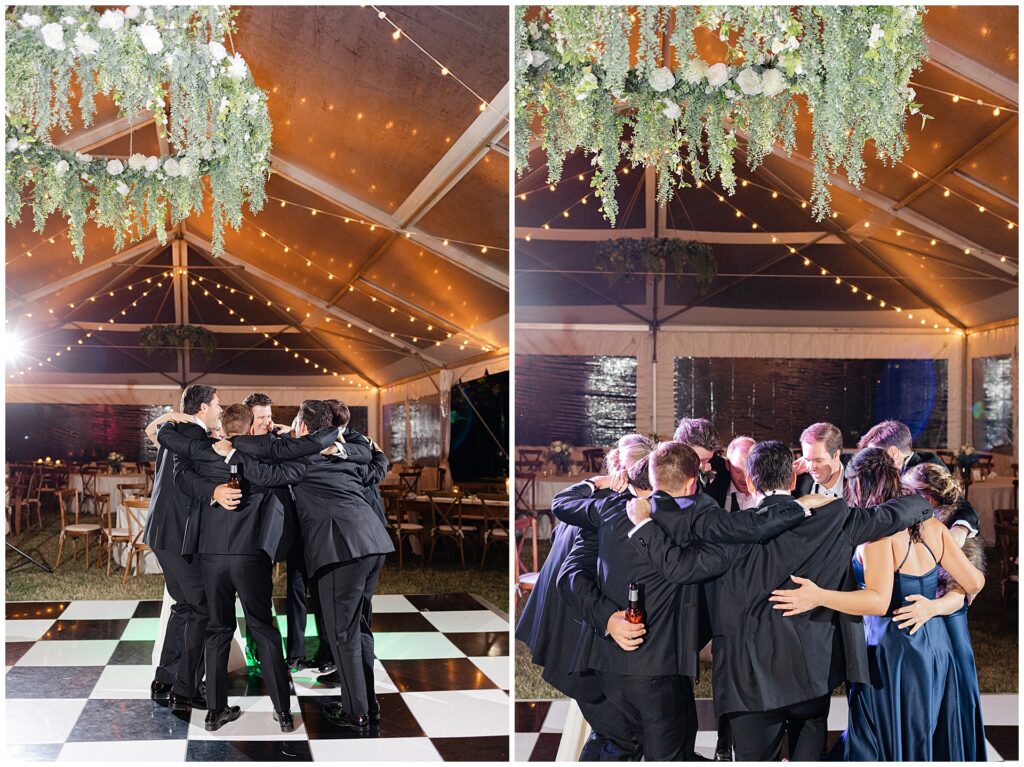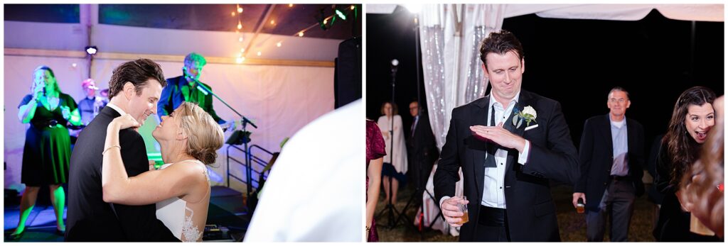 Waterfront weddings are at their strongest when the design allows the setting to breathe. Rather than leaning into overt nautical themes, many couples opt for timeless, architectural choices that frame the landscape instead of competing with it. Clear-top tents are especially effective along the water, allowing the sky, sunset, and surrounding environment to remain present well into the evening. Softer tenting materials and neutral palettes keep the focus on texture, movement, and light. Another popular option for Maryland waterfront weddings is a sailcloth tent. With its gentle peaks and warm, natural fabric, sailcloth offers an organic nod to the nautical setting without feeling overly scripted or literal. When paired with refined design elements, it creates a setting that feels intentional, elevated, and deeply connected to place. In this wedding, elements like a black-and-white checkered dance floor grounded the space with classic structure, while the clear-top tent preserved uninterrupted views of the waterfront. A live oyster shucking bar added a subtle sense of place—thoughtful and regionally inspired without becoming themed or forced.