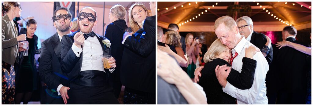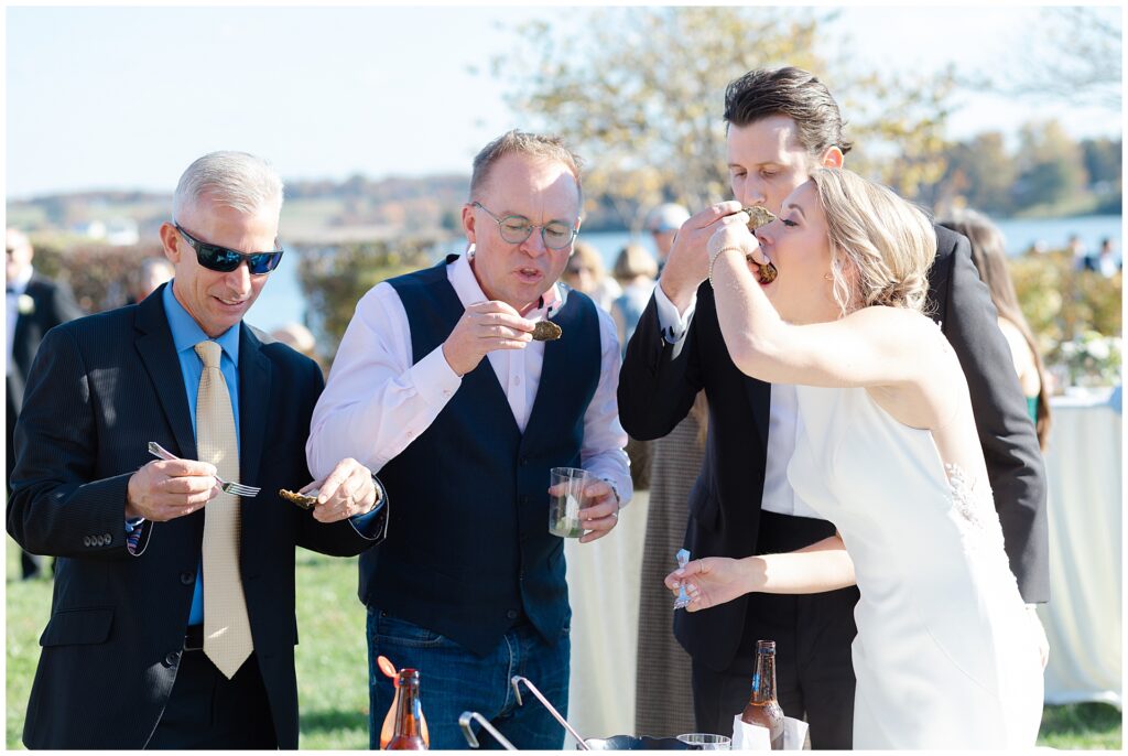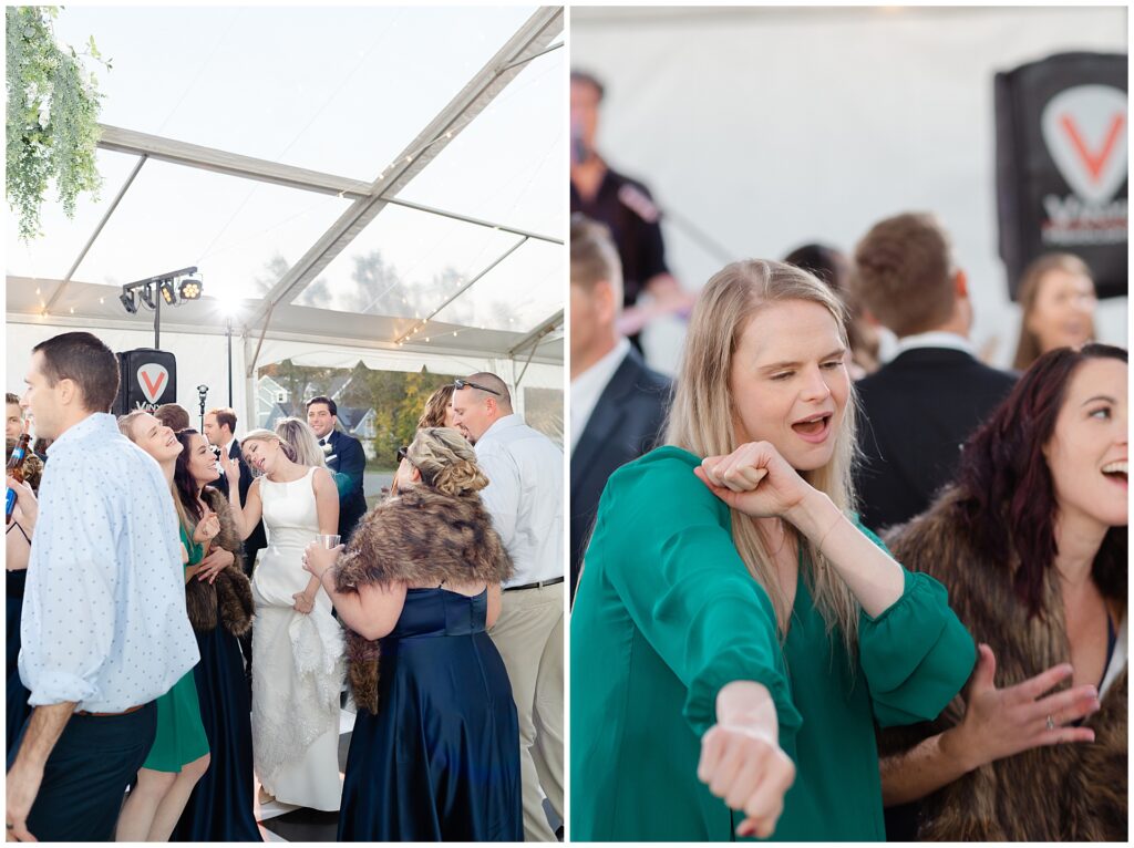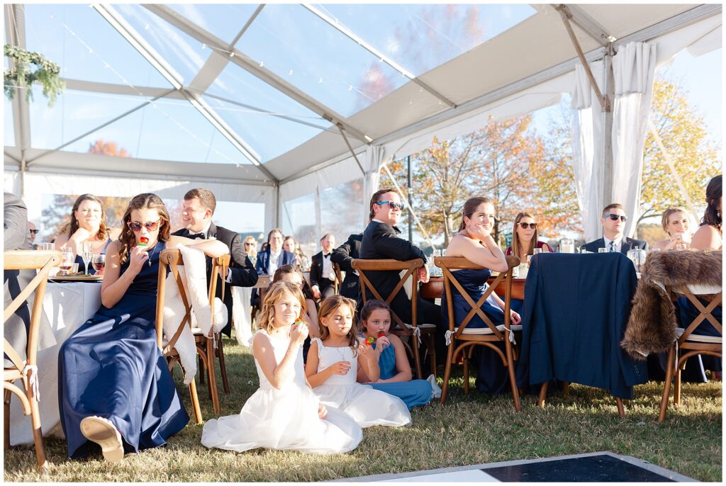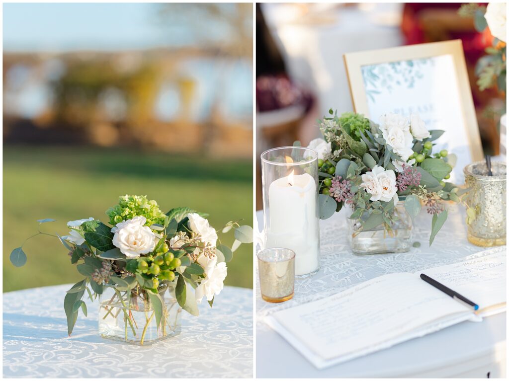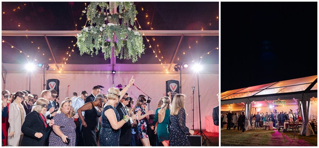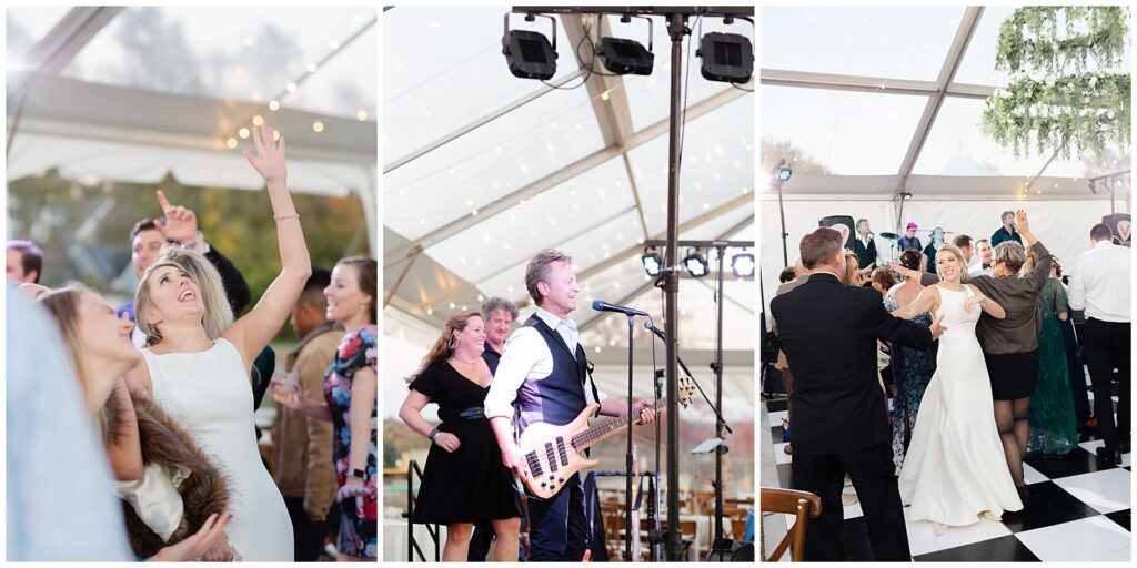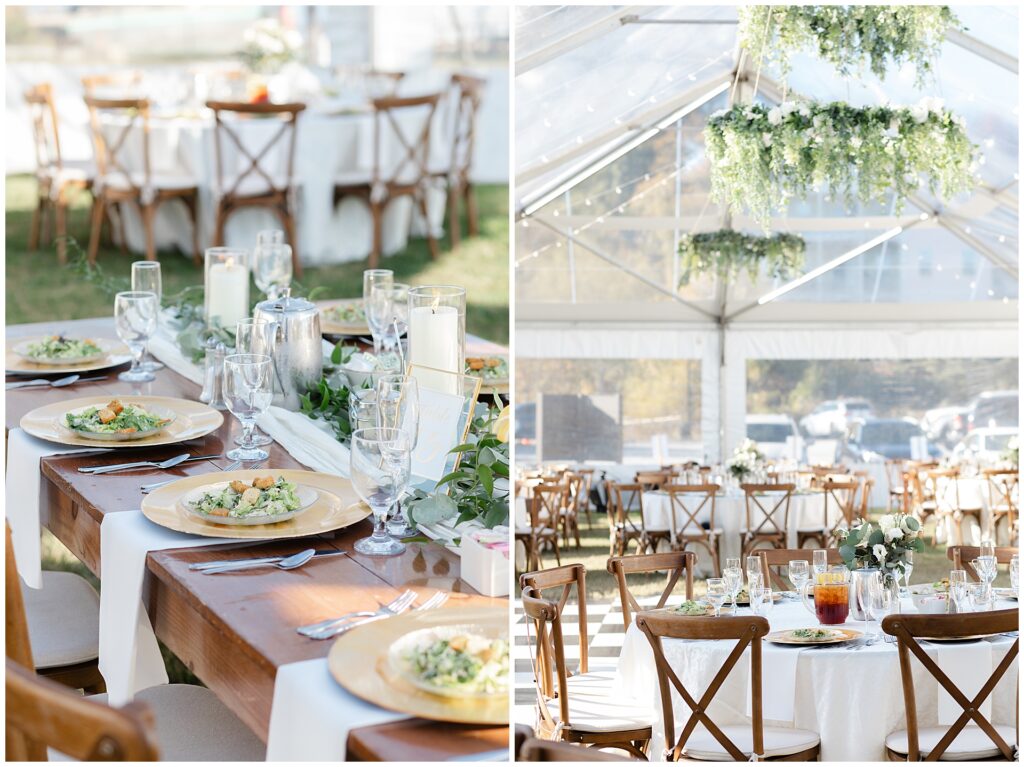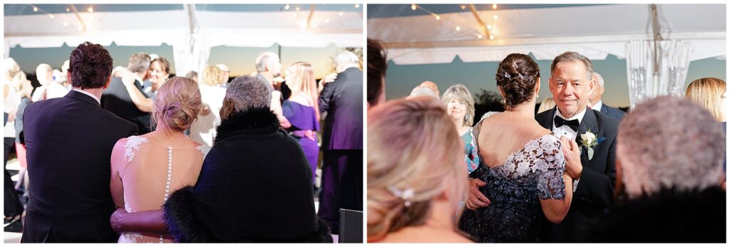Waterfront weddings are at their strongest when the design allows the setting to breathe. Rather than leaning into overt nautical themes, many couples opt for timeless, architectural choices that frame the landscape instead of competing with it. Clear-top tents are especially effective along the water, allowing the sky, sunset, and surrounding environment to remain present well into the evening. Softer tenting materials and neutral palettes keep the focus on texture, movement, and light. Another popular option for Maryland waterfront weddings is a sailcloth tent. With its gentle peaks and warm, natural fabric, sailcloth offers an organic nod to the nautical setting without feeling overly scripted or literal. When paired with refined design elements, it creates a setting that feels intentional, elevated, and deeply connected to place. In this wedding, elements like a black-and-white checkered dance floor grounded the space with classic structure, while the clear-top tent preserved uninterrupted views of the waterfront. A live oyster shucking bar added a subtle sense of place—thoughtful and regionally inspired without becoming themed or forced.
