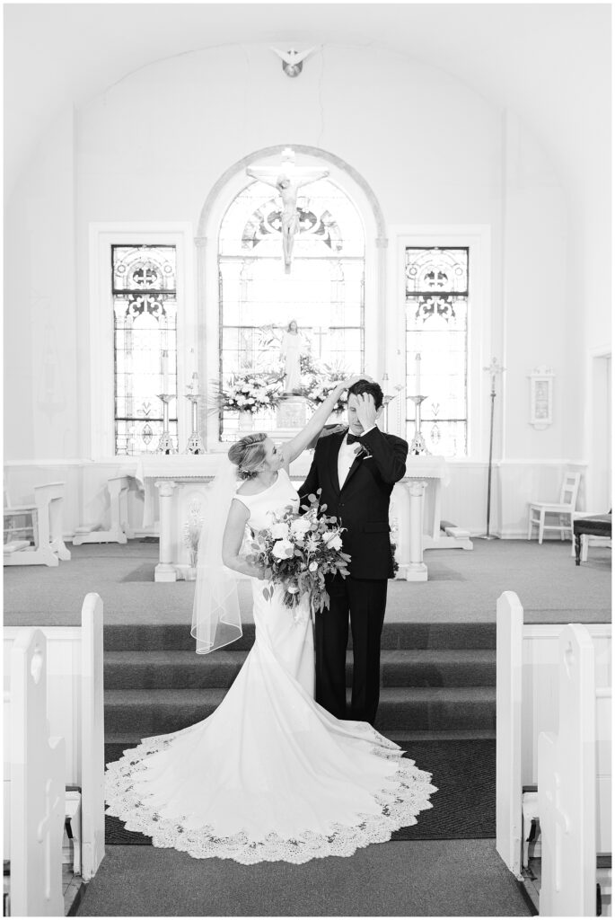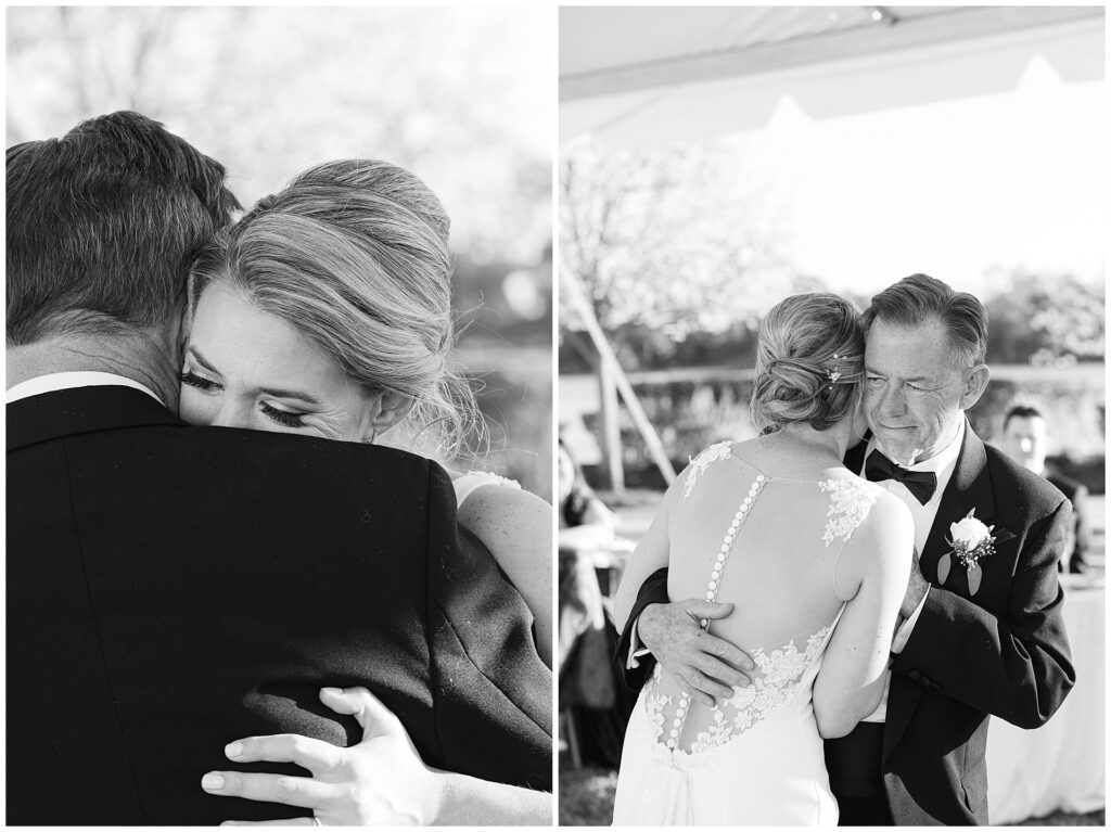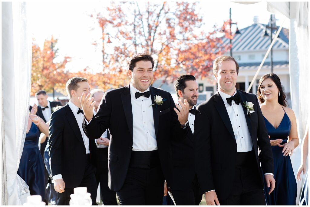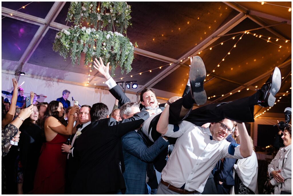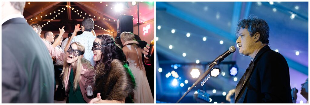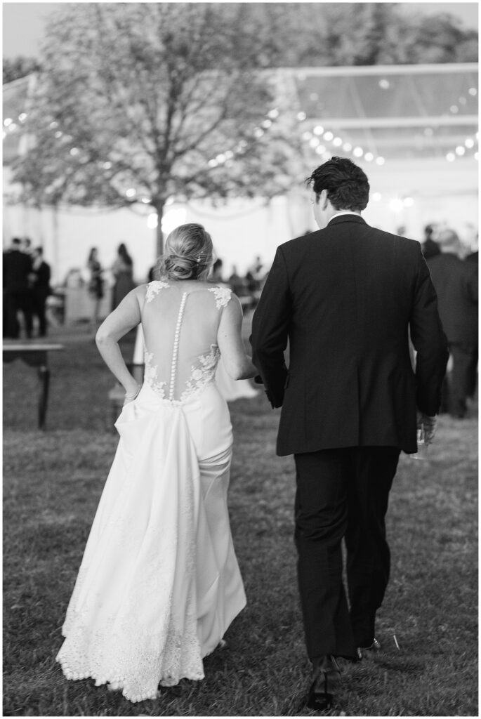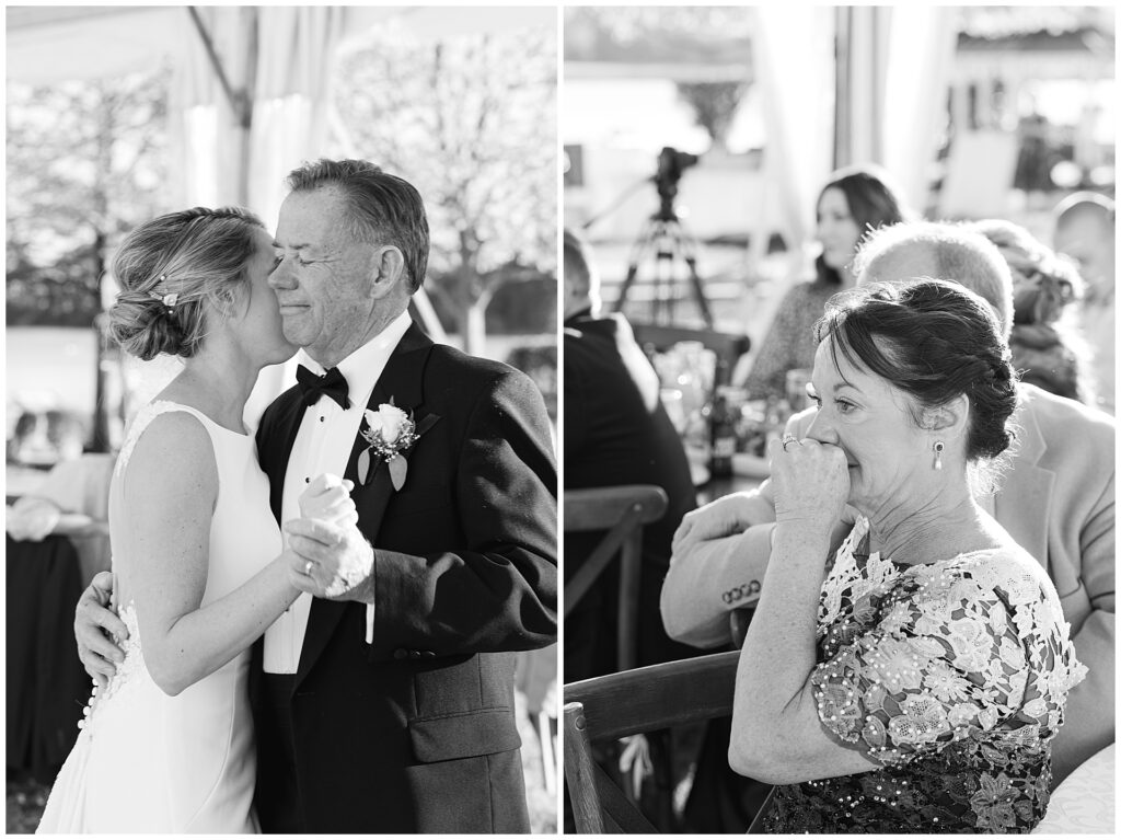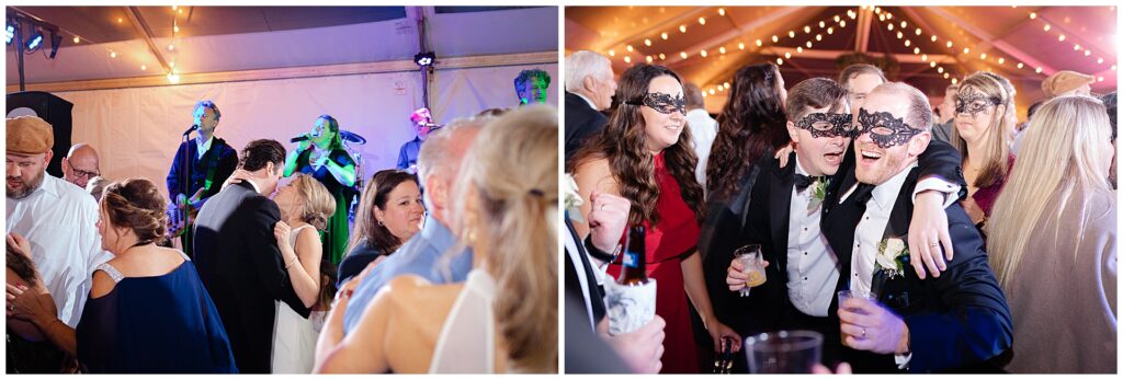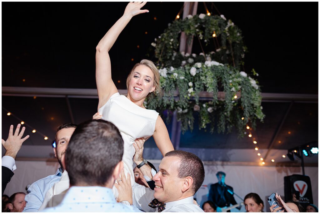 Waterfront weddings are at their strongest when the design allows the setting to breathe. Rather than leaning into overt nautical themes, many couples opt for timeless, architectural choices that frame the landscape instead of competing with it. Clear-top tents are especially effective along the water, allowing the sky, sunset, and surrounding environment to remain present well into the evening. Softer tenting materials and neutral palettes keep the focus on texture, movement, and light. Another popular option for Maryland waterfront weddings is a sailcloth tent. With its gentle peaks and warm, natural fabric, sailcloth offers an organic nod to the nautical setting without feeling overly scripted or literal. When paired with refined design elements, it creates a setting that feels intentional, elevated, and deeply connected to place. In this wedding, elements like a black-and-white checkered dance floor grounded the space with classic structure, while the clear-top tent preserved uninterrupted views of the waterfront. A live oyster shucking bar added a subtle sense of place—thoughtful and regionally inspired without becoming themed or forced.
